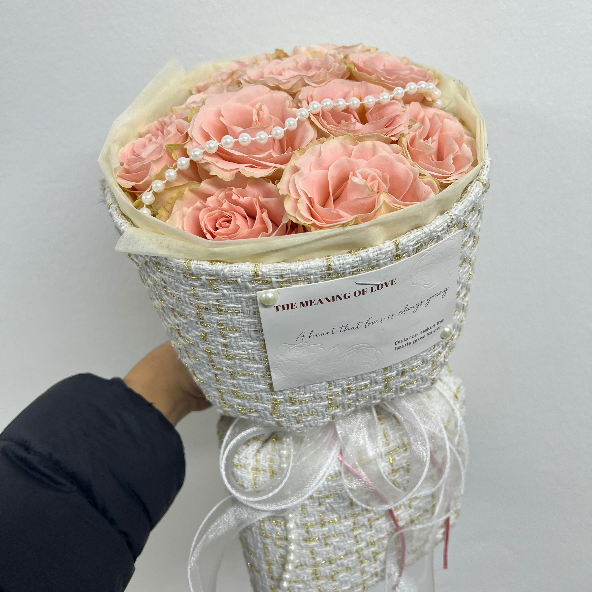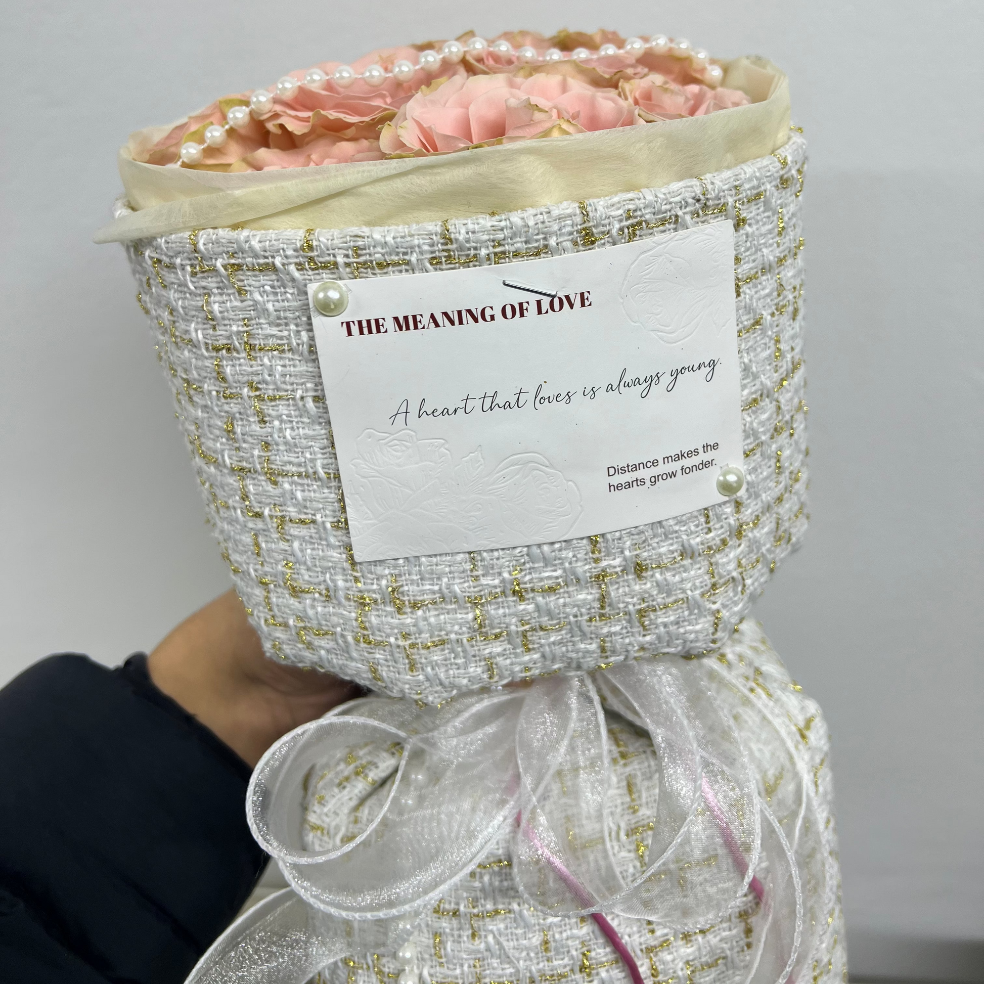 Delicadas rosas rosadas con elegante decoración de perlas y packaging exclusivo.