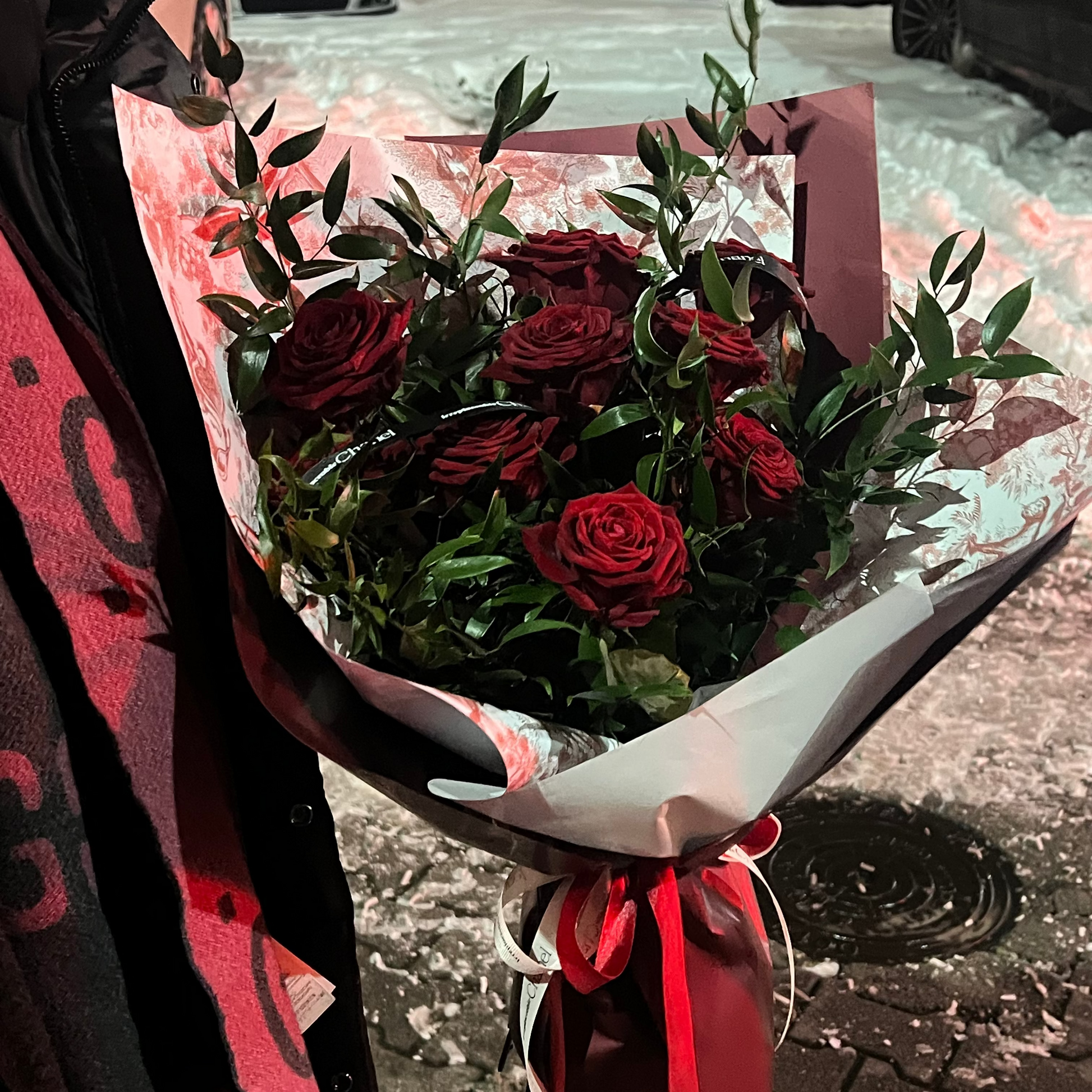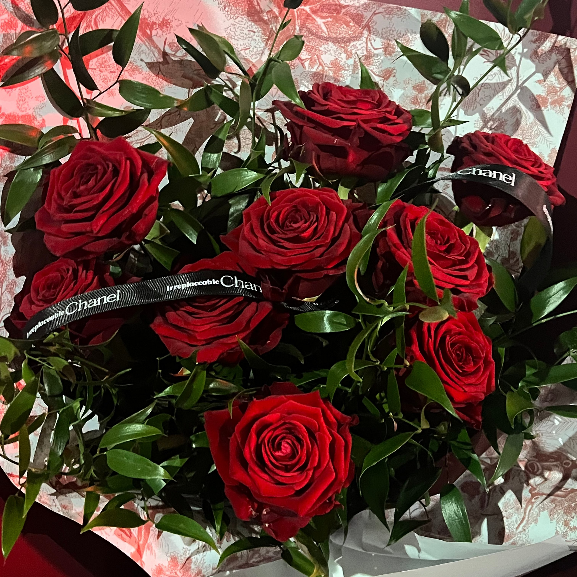 Rosas de color rojo intenso con accesorios en verde natural, unidas con un estilo lleno de carácter.